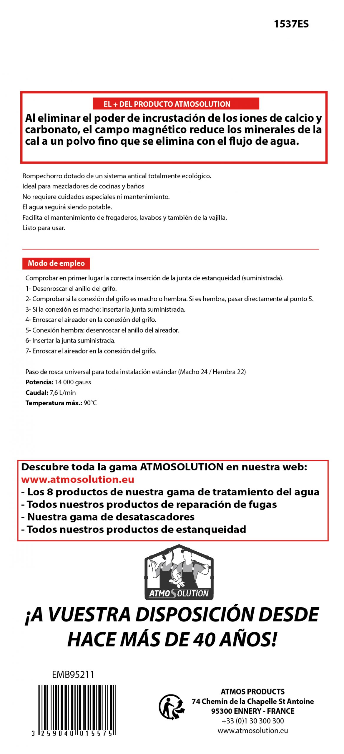 Dimensiones: (d) 2,5 x (h) 3,7 cm Rosca de tornillo universal para cualquier instalación estándar (M 24 / F 22) Potencia: 14.000 gauss Caudal: 7,6 l/min. Temperatura máxima: 90°C