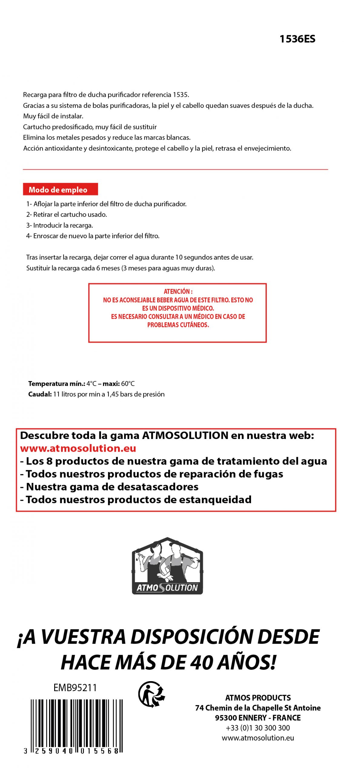 Recambio para filtro de ducha purificador Atmos. Gracias a su sistema de perlas purificantes, la piel y el cabello permanecen suaves.